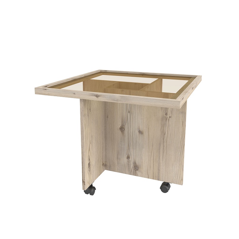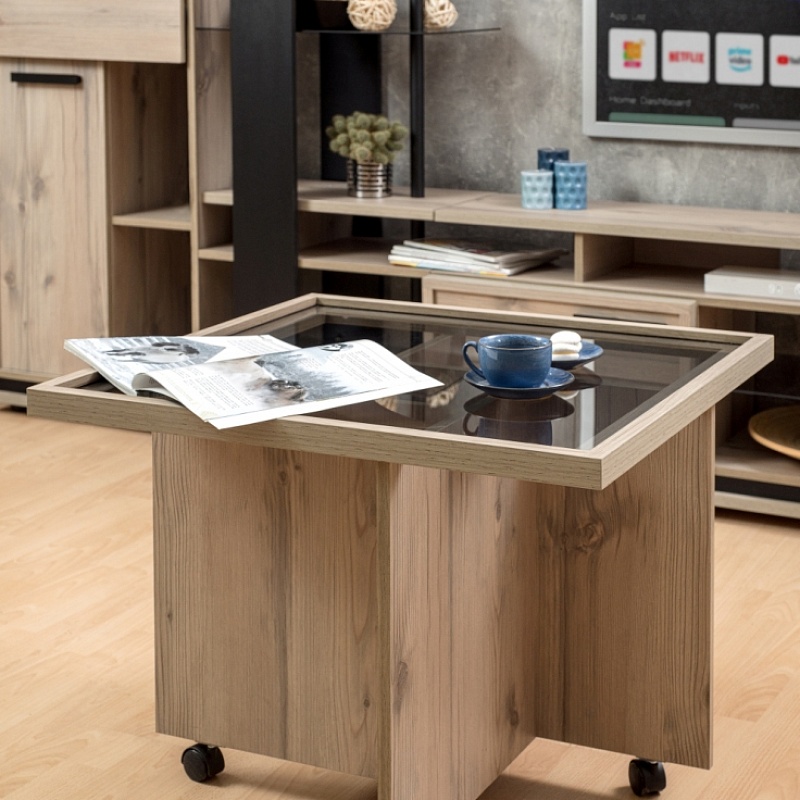 Квадратный журнальный столик в декоре в цвете Дуб Табачный и тонированной столешницей станет отличным дополнением для гостиной в стиле лофт. Перемещать столик будет легко благодаря колесным опорам.