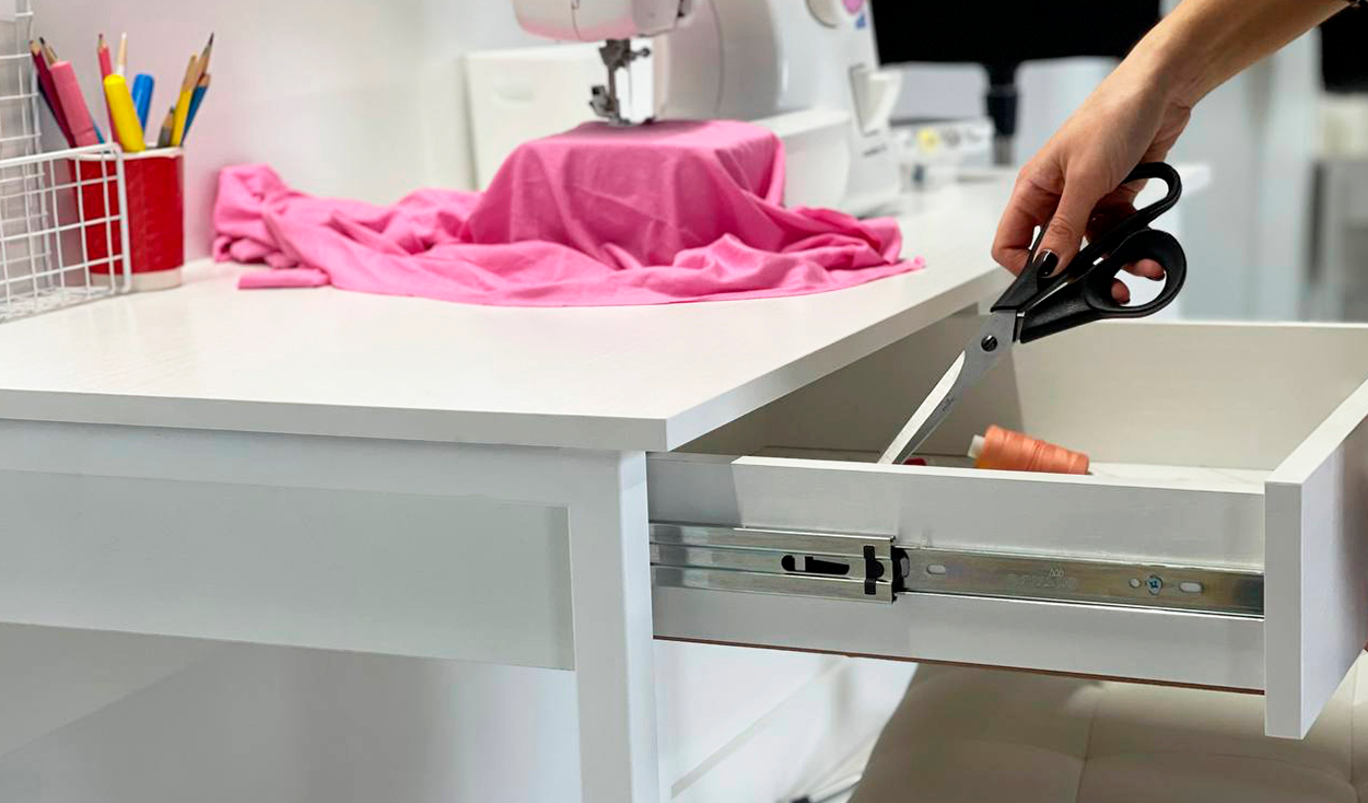 Стол на металлических опорах с двумя выкатными ящиками на шариковых направляющих, усиленный и надежный каркас, благодаря металлическому ребру жесткости под столешницей,