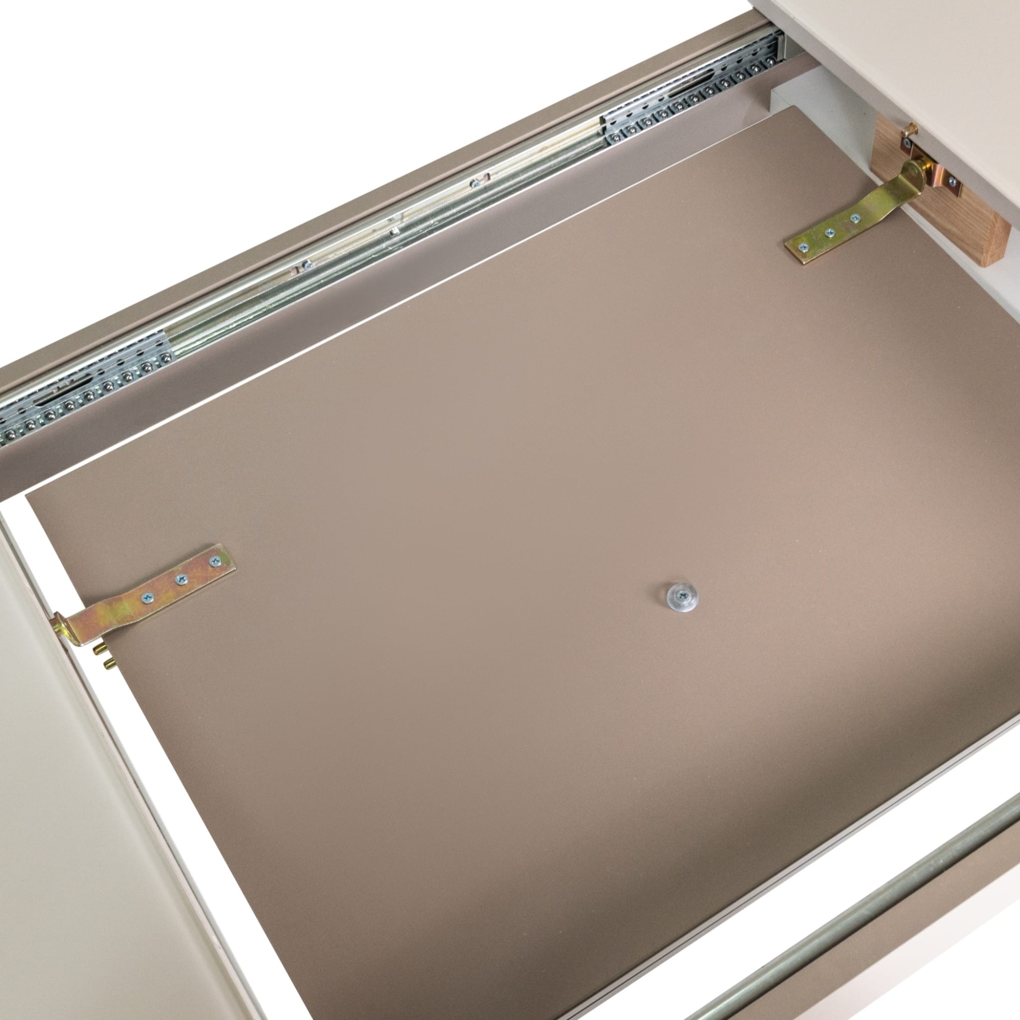 Стол полуовальной формы со стеклянной поверхностью – отличное решение для современных интерьеров. Скругленная форма углов эргономична для пространства дома, а отражающая поверхность поможет гармонично вписаться в интерьер и добавит больше света. Материал столешницы из ЛДСП + стекло, цвет – белый. Благодаря механизму трансформации стол увеличивается на 550 мм, вставка из ЛДСП белого цвета. Вставка стола хранится внутри.