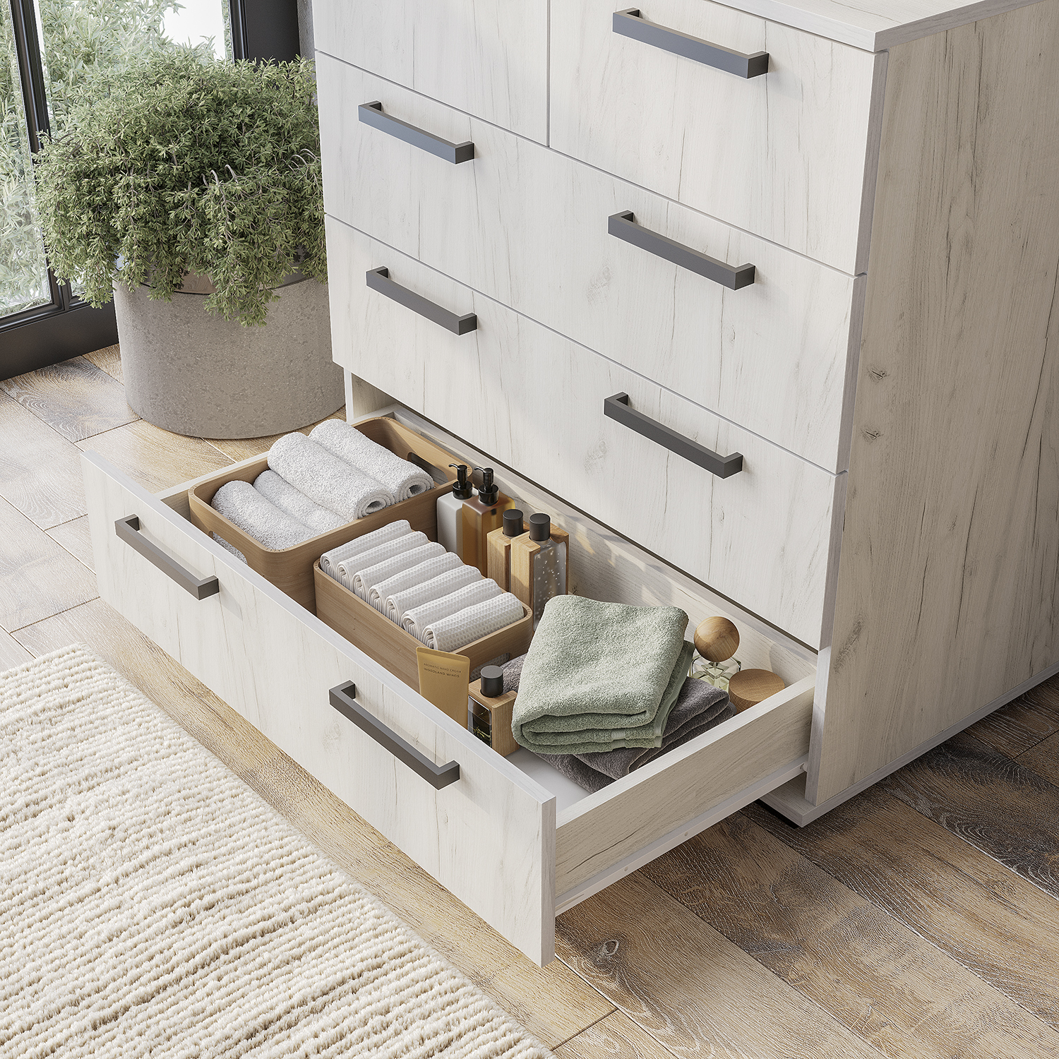 Универсальное решение для хранения вещей в любом помещении: гостиной, спальне или домашнем офисе. Лаконичная прямоугольная форма помогает грамотно организовать пространство, а нейтральный оттенок «дуб крафт белый» легко вписывается в любой интерьер.