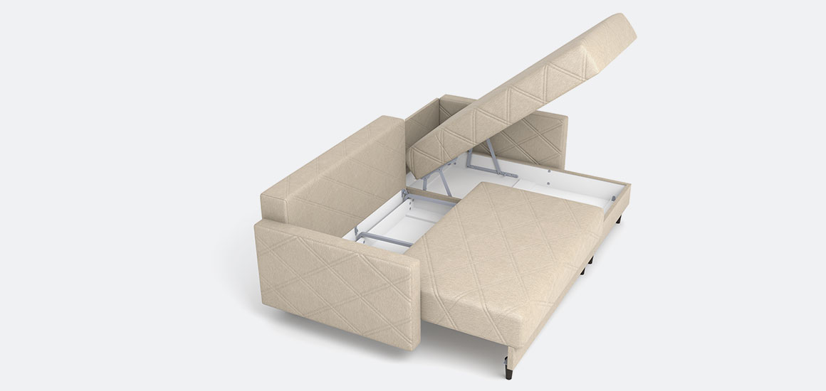 · Система хранения: Вместительный бельевой ящик расположен в оттоманке и раскладной секции — идеальное место для хранения постельных принадлежностей.