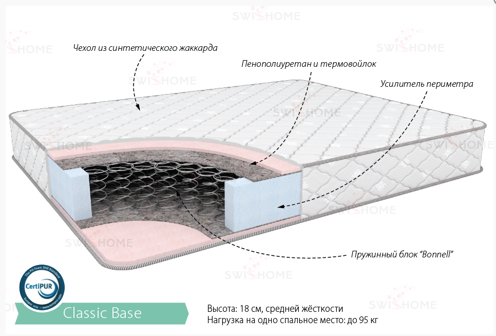 В основе матрасов данной серии пружинный блок «Bonnell» – классический блок из связанных между собой пятивитковых пружин высотой 140 мм, имеющих биконусную конструкцию, то есть форму песочных часов. Такая конфигурация обеспечивает равномерное распределение нагрузки, исключает соприкосновение витков, трение и шум.