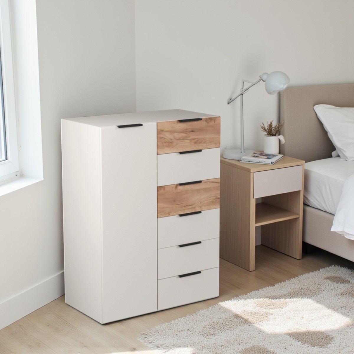 Элегантный комод Севиль с комбинированной отделкой: корпус в цвете Кашемир и фасады под натуральное дерево Дуб Крафт. Модель оснащена шестью просторными выдвижными ящиками на надежных роликовых направляющих и функциональным отсеком с дверцей и внутренними полками. Идеальное решение для хранения вещей в спальне, гостиной или прихожей. Сочетает в себе лаконичный дизайн и высокую вместительность.
